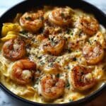 Grease a 9Ă—13-inch baking dish, then transfer the creamy pasta and shrimp mix into it, spreading it out evenly. In a small bowl, combine your panko breadcrumbs, melted butter, and additional Parmesan cheese, then sprinkle this crispy topping evenly over the dish. Bake for 20 to 25 minutes until the top is a beautiful golden brown and delightfully crunchy.