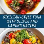Sicilian-Style Tuna with Olives and Capers is a flavorful Mediterranean dish featuring pan-seared tuna steaks served in a vibrant sauce made from garlic, anchovies, red pepper flakes, white wine, cherry tomatoes, capers, Sicilian olives, and pine nuts. Finished with fresh parsley, this quick and elegant seafood recipe brings the authentic tastes of Sicily to your table in just 35 minutes.