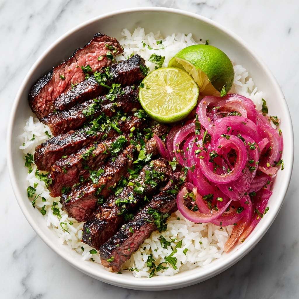 For casual gatherings, serve everything family-style with bowls of rice, chimichurri sauce, and sliced steak to let everyone assemble their own bowls. If you’re aiming for a more elegant presentation, try plating individual bowls with artistically drizzled sauce and delicate herb sprigs for a restaurant-worthy look that’s still cozy and inviting.