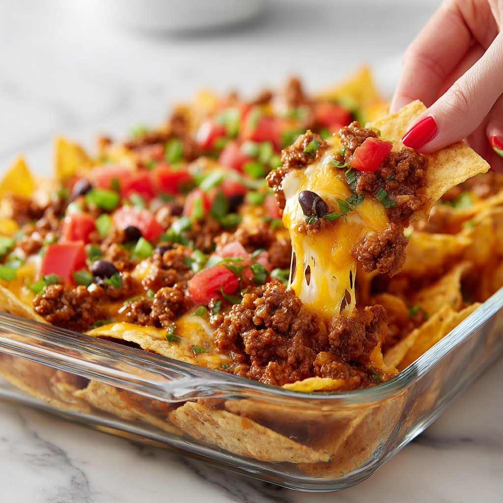 Once out of the oven, sprinkle your nachos generously with diced tomato and minced fresh chives. These fresh toppings add a pop of color along with a cooling contrast to the warm, smoky layers beneath. Now it’s ready to serve and enjoy with your favorite dips or sauces on the side.