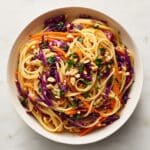While the spaghetti cools, shred the red cabbage and carrots, then thinly slice the red bell pepper and green onions. Chop the fresh cilantro and roast the peanuts if they’re not already roasted. Gathering these fresh, colorful vegetables in one big bowl makes assembling the salad a breeze and ensures every forkful is bursting with different textures and flavors.
