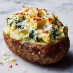 These Spinach Artichoke Twice Baked Potatoes are a comforting and nutritious twist on a classic dish, perfect for cozy nights. Baked russet potatoes are scooped and filled with a creamy, dairy-free mixture of sautéed spinach, tangy artichoke hearts, coconut cream, and nutritional yeast for a savory, umami-rich flavor. Finished with a second bake to develop a golden top, this recipe is both satisfying and flavorful without the use of dairy.