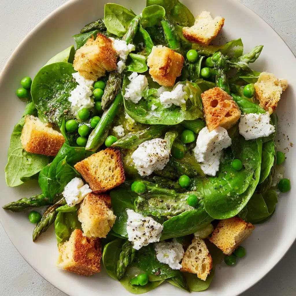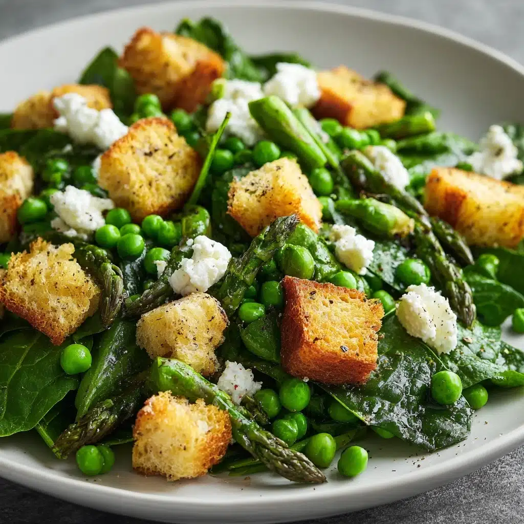 This Spring Panzanella Salad is a vibrant Italian bread salad featuring toasted day-old crusty bread, fresh spring vegetables like asparagus, cherry tomatoes, cucumber, and radishes, all tossed in a tangy Dijon and red wine vinegar dressing and topped with crumbled feta cheese. Perfect for a light, refreshing meal or side dish, it beautifully balances crunchy textures with fresh, herbaceous flavors.