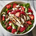 A fresh and vibrant Strawberry Chicken Salad featuring grilled chicken breasts, mixed greens, juicy strawberries, tangy feta cheese, crunchy walnuts, and a zesty balsamic vinaigrette. Perfect for a quick, healthy lunch or light dinner.