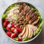 While your chicken is resting, slice your Gala apple and strawberries into bite-sized pieces. Evenly distribute the fruit over the lettuce in each bowl, followed by the dried cranberries, shredded mozzarella, and crushed walnuts. Finally, add the sliced grilled chicken on top. Your salad is ready to shine! Dress it generously with your favorite choice of creamy poppyseed dressing or raspberry vinaigrette and enjoy every fresh, crunchy bite.
