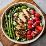 A refreshing and vibrant Strawberry Chicken Salad featuring tender cooked chicken breast, fresh strawberries, aromatic mint, tangy goat cheese, and crunchy toasted nuts, all tossed in a light balsamic vinaigrette. Perfect for a healthy main course that’s quick to prepare and ideal for warm weather meals.