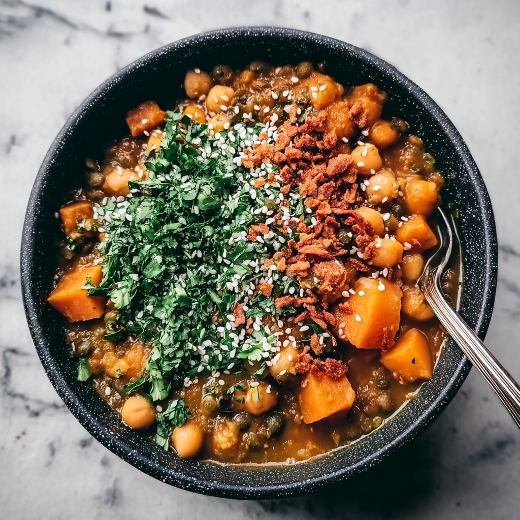 This Sweet Potato Lentil Curry with Crispy Sesame Chickpeas is a vibrant and hearty vegetarian curry combining tender sweet potatoes and red lentils simmered in a spiced coconut milk broth. Topped with crunchy oven-roasted sesame-spiced chickpeas, this dish offers layers of texture and flavor, perfect for a comforting and nutritious meal.