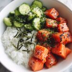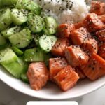 5. Assemble and Serve: Spoon the cooked jasmine or basmati rice onto plates or bowls. Top the rice with the air-fried salmon bites, add a scoop of the avocado cucumber salad on the side, and drizzle generously with the sriracha mayo. Finish with a sprinkle of sesame seeds for garnish. Serve immediately.