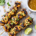 This Chicken Satay recipe features tender strips of marinated chicken grilled to perfection and served with a rich, creamy peanut sauce. The dish combines bold flavors like soy sauce, fish sauce, lime juice, honey, and Sriracha, offering a perfect balance of sweet, tangy, and spicy notes. Ideal for a flavorful appetizer or main dish, it’s garnished with fresh cilantro, chopped peanuts, and lime wedges for added texture and brightness.
