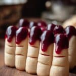 Press one red-painted almond onto the tip of each cookie dough finger. This is the moment your Witch Finger Cookies start to come alive! The contrast between the pale dough and the vivid red “nail” is the perfect eerie touch.